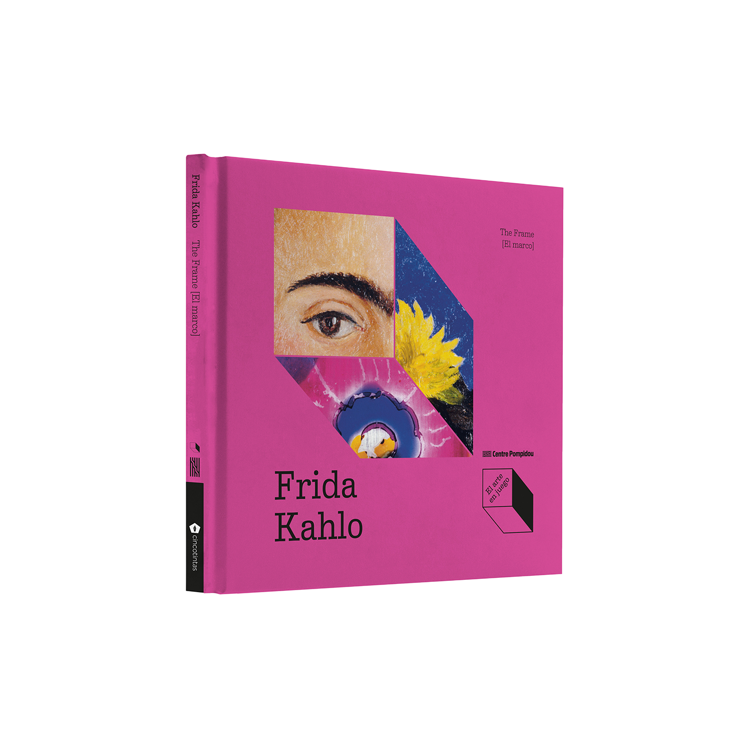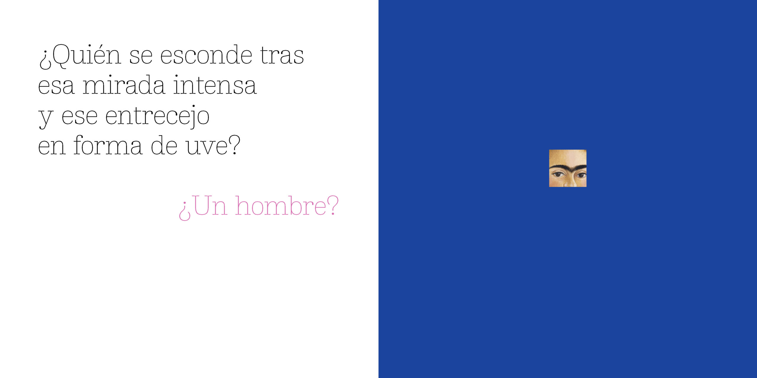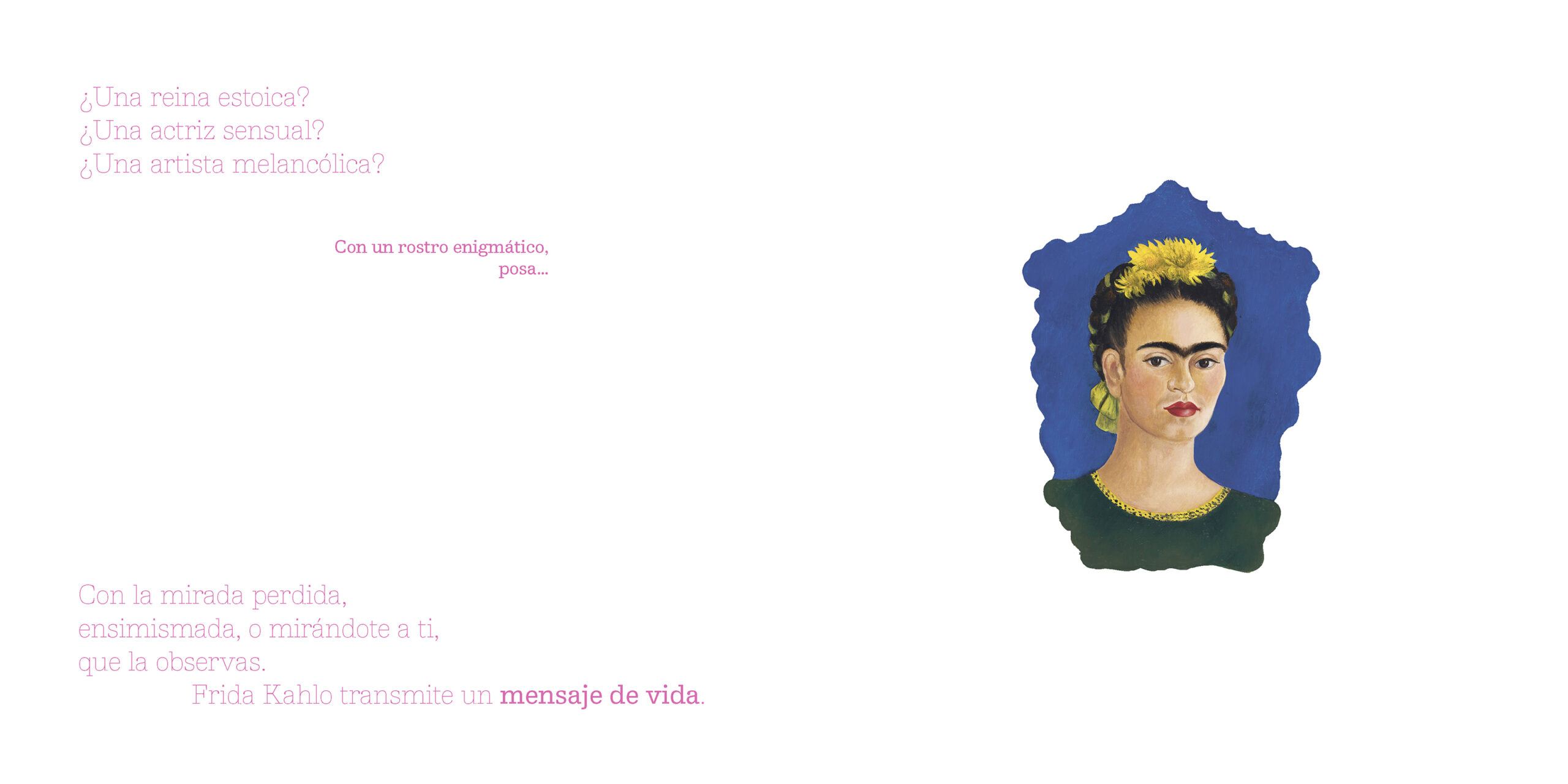 y reúnen en un jubiloso corro. En medio de un intenso fondo azul, Frida Kahlo nos mira. Artista y modelo a la vez, transmite un mensaje de vida.