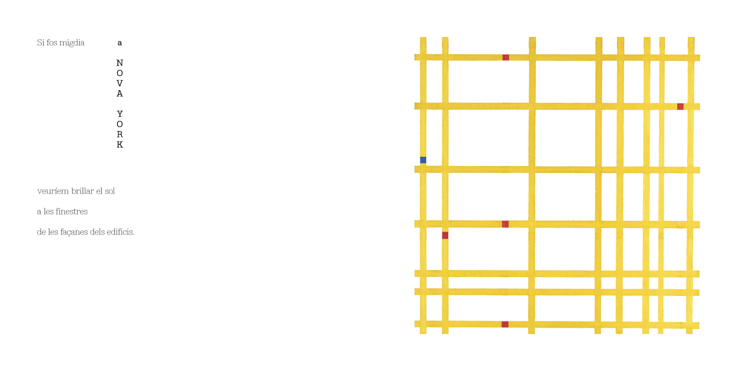 New York City: rectangles vermells, grocs i blaus. Línies verticals i horitzontals encreuades. Fins a l’infinit. Jocs de siluetes i retalls que exploren aquestes geometries variables. L’autora del llibre revela amb habilitat el procés creatiu de Mondrian, impregnat i alimentat per l’activitat frenètica de Nova York, fins a arribar a aquesta representació depurada, com una finestra oberta al Nou Món.
